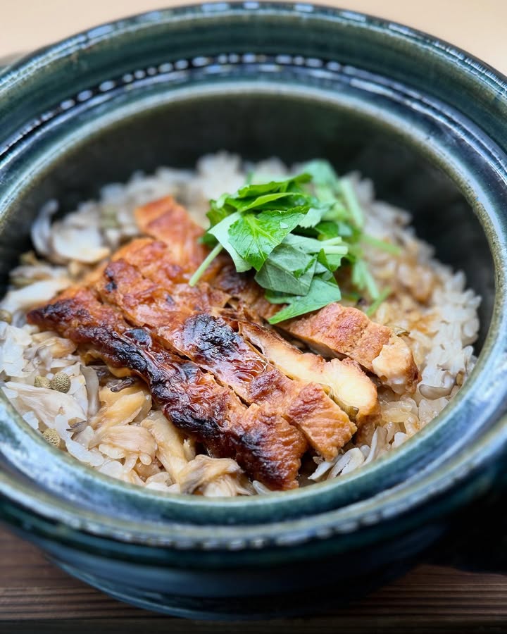 香ばしく蒲焼きにした穴子を土鍋で一緒に炊き上げることで、穴子の旨味がぎゅっとお米に閉じ込められています。さらに、実山椒が香りを添え、ふっくらとした穴子の食感も存分にお楽しみいただけます。