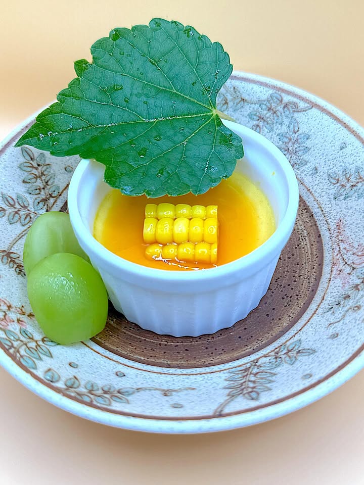 主役は、夏の旬の味覚であるとうもろこし。その豊かな甘みと香りを、ぎゅっと閉じ込めてプリンに仕立てました。
