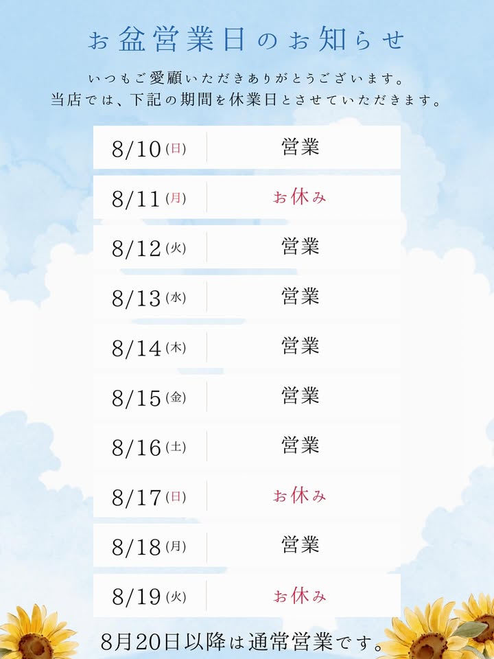 "お盆期間中の営業についてのお知らせ"